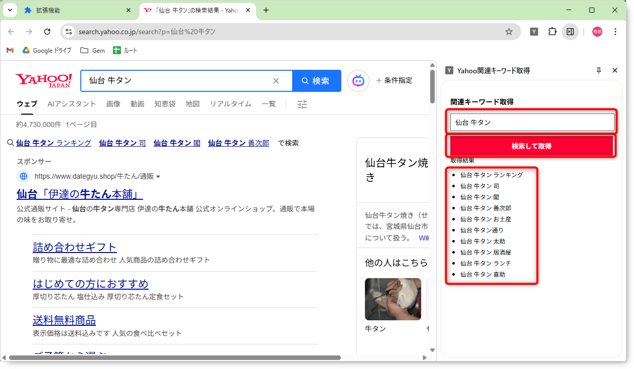 3. 新しいタブでYahoo検索が開き、サイドパネルに関連キーワードが表示されれば成功です!